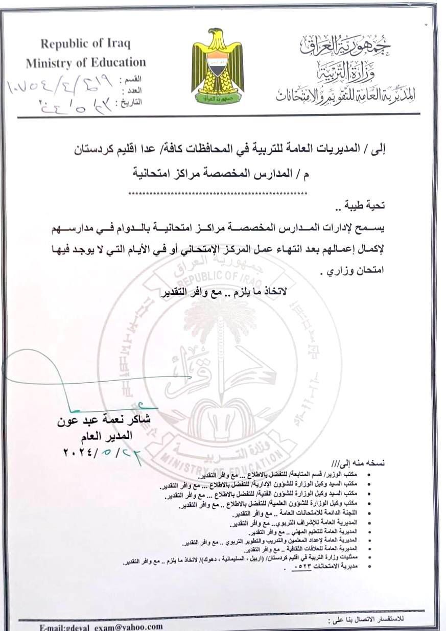 Share Facebook Twitter LinkedIn Pinterest Email بغداد / نينا / اعلنت وزارة التربية / المديرية العامة للتقويم والامتحانات ، السماح لادارات المدارس المخصصة مراكز امتحانية ، بمزاولة عملها ./ انتهى2 Source link
