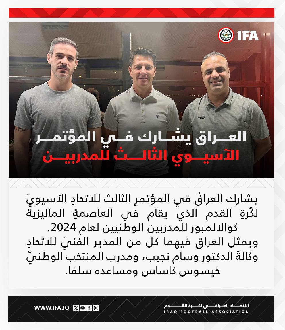Share Facebook Twitter LinkedIn Pinterest Email بغداد / نينا/ يشارك العراقُ في المؤتمرِ الثالث للاتحادِ الآسيويّ لكُرةِ القدم الذي يقام في العاصمةِ الماليزية كوالالمبور للمدربين الوطنيين لعام 2024. ويمثل العراق في المؤتمر المدير الفنيّ Source link
