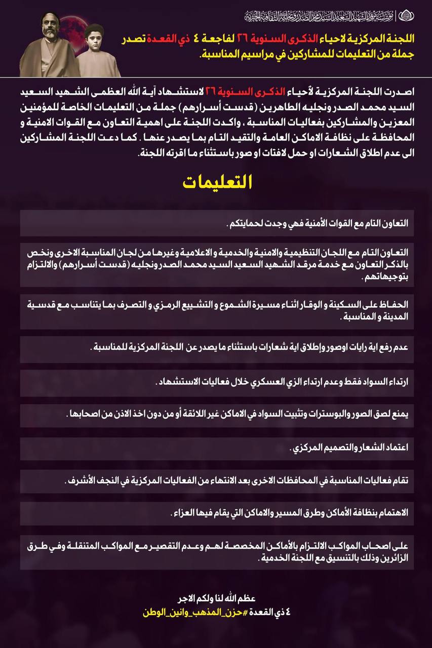 Share Facebook Twitter LinkedIn Pinterest Email النجف/نينا/ أصدرت اللجنة المركزية لإحياء الذكرى السنوية ٢٦ ذكرى المرجع الشهيد محمد الصدر ونجليه جملة من التعليمات الخاصة للمعزين والمشاركين بفعاليات المناسبة . وأكدت في تعليماتها على اهم Source link