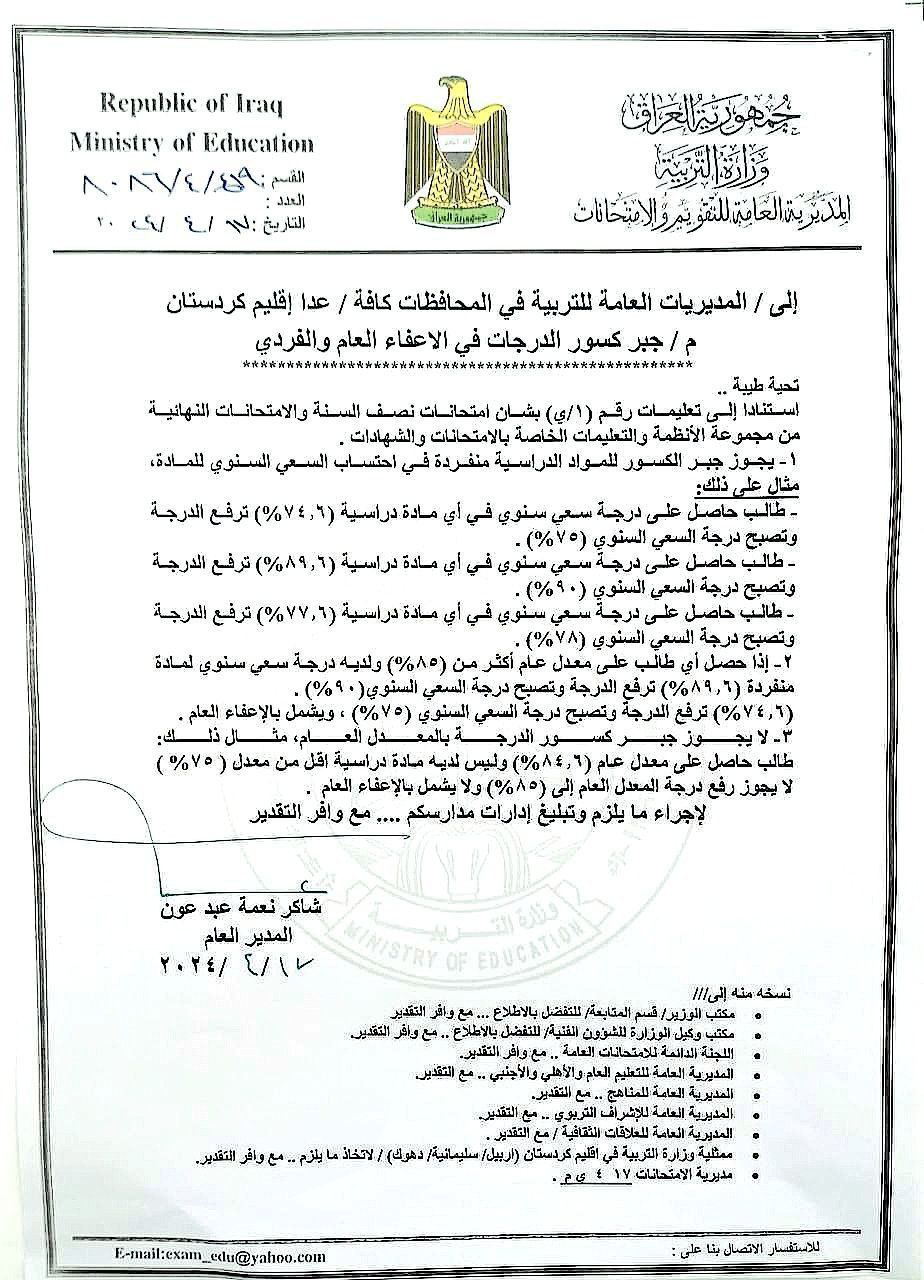 Share Facebook Twitter LinkedIn Pinterest Email بغداد/نينا/ أوضحت وزارة التربية/ المديرية العامة للتقويم والامتحانات، آلية وكيفية جبر كسور الدرجات في حالة الإعفاء العام والفردي./انتهى2 Source link