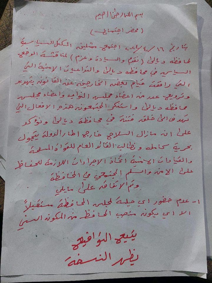 Share Facebook Twitter LinkedIn Pinterest Email بعقوبة / نينا / قرر ممثلو الكتل السياسية السنية في مجلس ديالى مقاطعة جلسات مجلس المحافظة ما لم يتم اختيار محافظ من المكون السني . واتفقت كتل “تقدم” و”السيادة” و”عزم”، بحسب محضر اجتماع على Source link