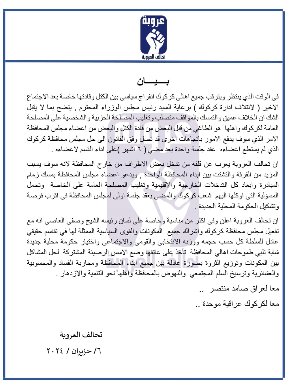 Share Facebook Twitter LinkedIn Pinterest Email كركوك /نينا/حذر تحالف العروبة في كركوك ،من وجود تدخلات إقليمية في موضوع تشكيل الحكومة المحلية في المحافظة . وقال التحالف في بيان:” في الوقت الذي ينتظر ويترقب فيه جميع اهالي كركوك انفر Source link