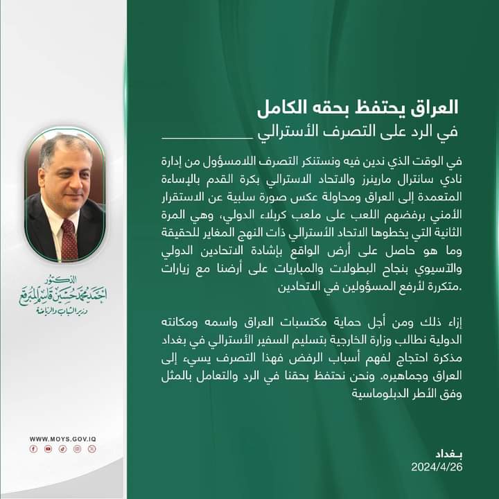 Share Facebook Twitter LinkedIn Pinterest Email بغداد / نينا/ طالب وزير الشباب احمد المبرقع وزارة الخارجية بتسليم السفير الأسترالي في بغداد مذكرة احتجاج لفهم أسباب رفض نادي سانترال مارينرز اللعب على أرض العراق. وقال الوزير في بيان انه Source link