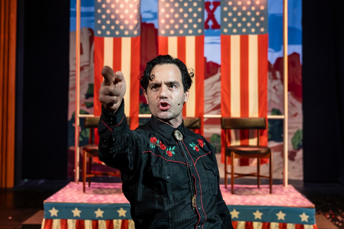With its cheery 1950s palette and poster-paint backdrop, Kwame Kwei-Armah’s production never quite breaks out of its one-dimensionality. Yes, the rhinestones and American flags and guns amass, and there’s a sense of drifting garishly into American nightmare. But, mostly, it has the satirical bite of a Hallmark movie, with the same romantic trajectory.