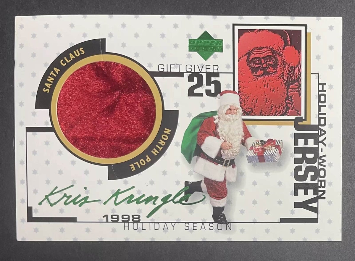 In 1998, Upper Deck produced an oversized Kris Kringle promotional card featuring a velvety red “holiday-worn jersey” that was exclusive to members of the company’s Collector’s Club. The card can be found on eBay for about $20.