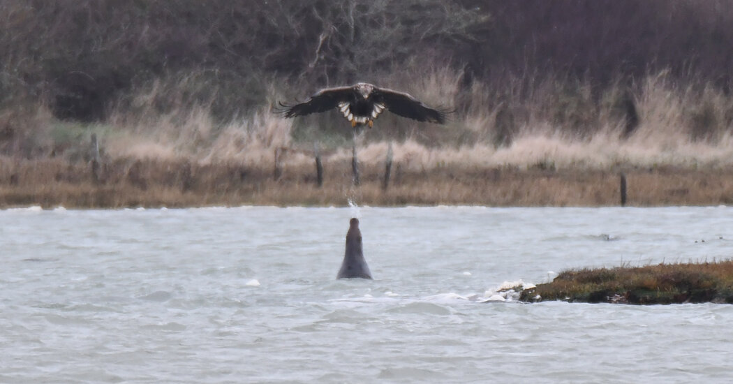Sean Twiss, a professor at Durham University who’s spent 30 years studying grey seals, has never seen one spitting. He thinks it’s possible that the seal aimed to deter the eagle, or that it was just being playful. Seals often feed at depth and don’t usually forage in such shallow water bodies such as this harbor, he said, so he couldn’t be sure what the motivation was for the water spout.