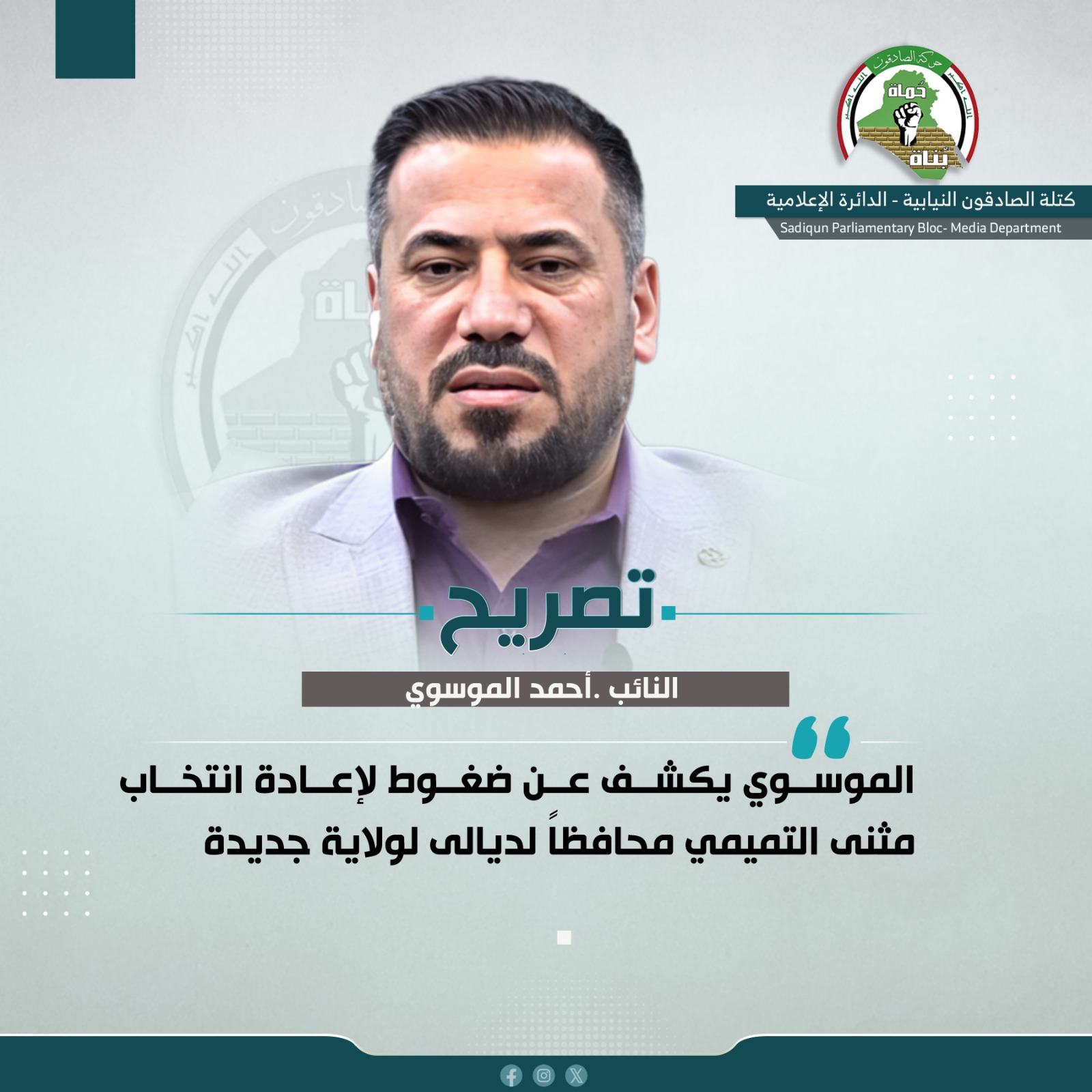 Baghdad / NINA / The representative of the Al-Sadiqoun bloc, Ahmed Al-Musawi, revealed, on Thursday, the existence of pressure to re-elect Muthanna Al-Tamimi, as governor of Diyala for a new term, while warning of the repercussions of continuing these pressures on the security of the country.