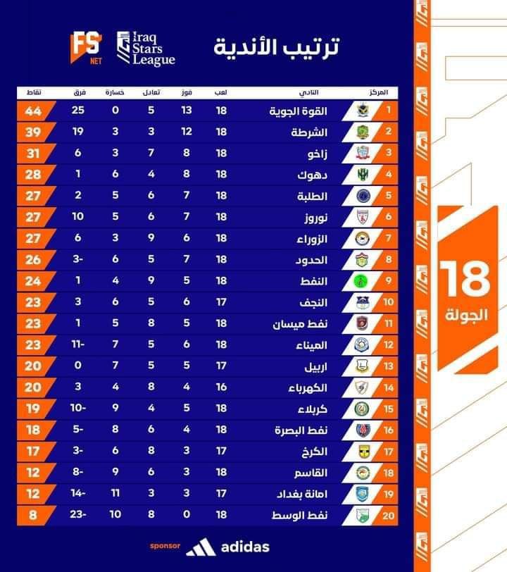 Share Facebook Twitter LinkedIn Pinterest Email Baghdad / NINA / The Iraqi Football Association announced the club standings at the conclusion of the 18th round of the Iraq Stars League, which was led by the Al-Quwa Al-Jawiya team with 44 points./End 5 Source link