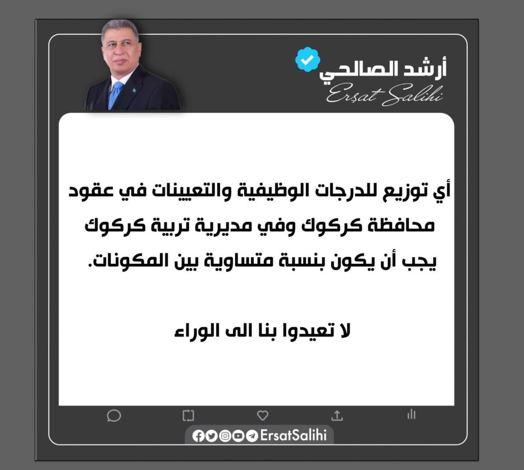 Share Facebook Twitter LinkedIn Pinterest Email Kirkuk / NINA / The head of the Human Rights Committee, head of the Turkmen bloc in the House of Representatives, Arshad Al-Salihi, called for equality in job grades and contracts in Kirkuk. He said in a tweet: “Any distribution of job grades Source link