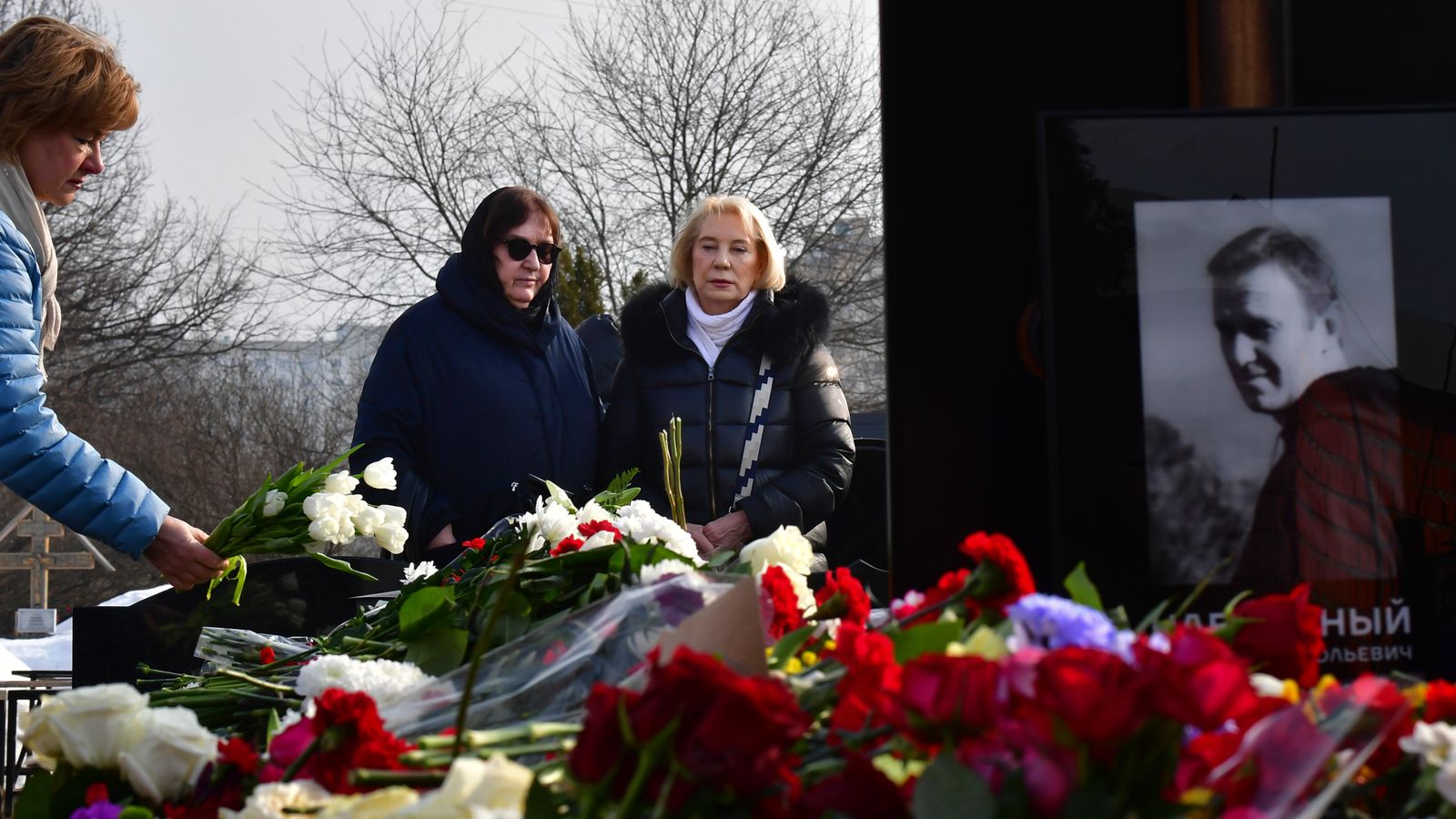 Alexei Navalny’s mother and mother-in-law have laid flowers at his grave in Moscow the day after thousands of people attended his funeral in a public show of defiance.