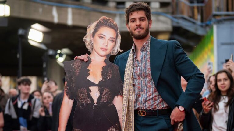 Last night, British actor Andrew Garfield arrived at the London Film Festival premiere of his latest film “We Live in Time” sporting a surprising accessory. No, not the yellow paisley opera scarf — the lifesize cutout of co-star Florence Pugh.