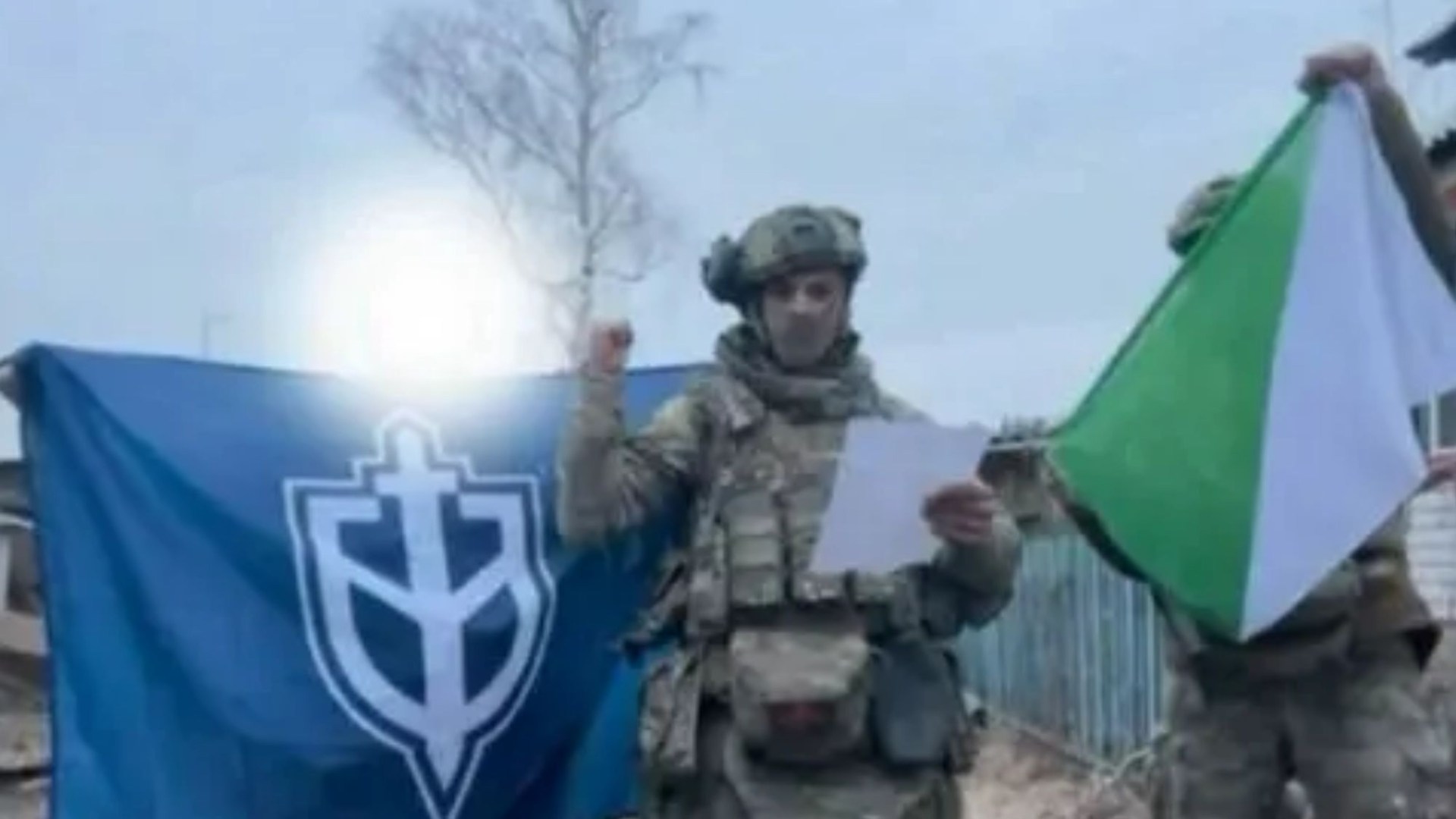 A victory picture shared on Telegram shows members of the SB and RDK brandishing their flags in the village.