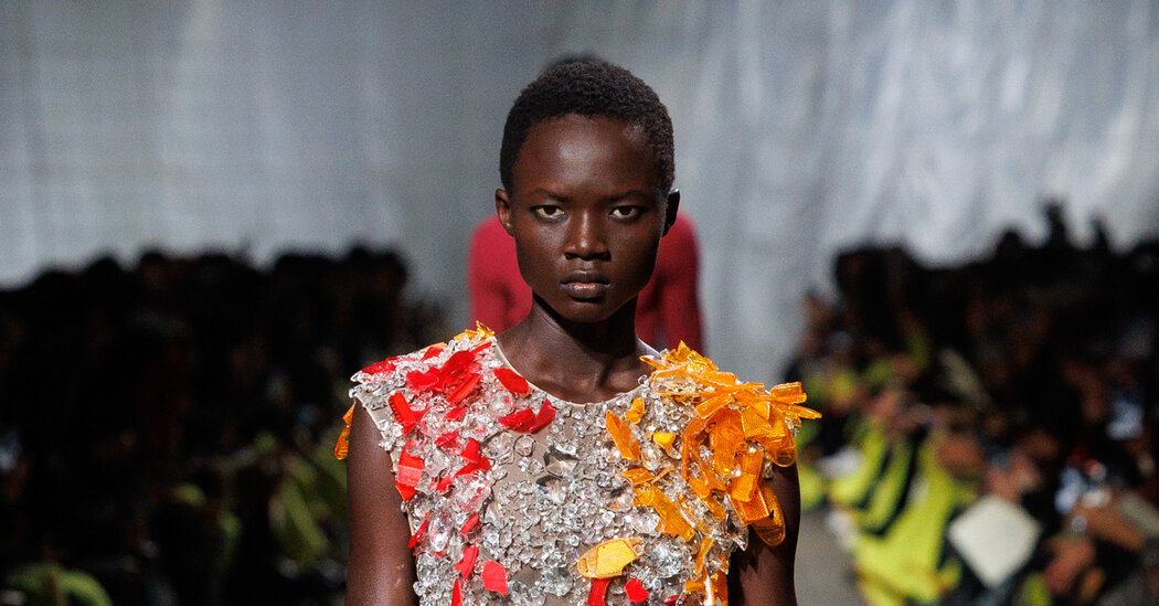 There was some sharp tailoring: nipped-in trouser suits covered in broken pieces of jet with shearling vests exploding from within. There were giant sweaters that looked as if they were swallowing the models whole, over leather trousers. A tank dress covered in what was meant to resemble smashed glass, inspired by Mr. McGirr’s smashed cellphone screen. Some molded steel mini dresses, like wearable car chassis (forget sitting down).