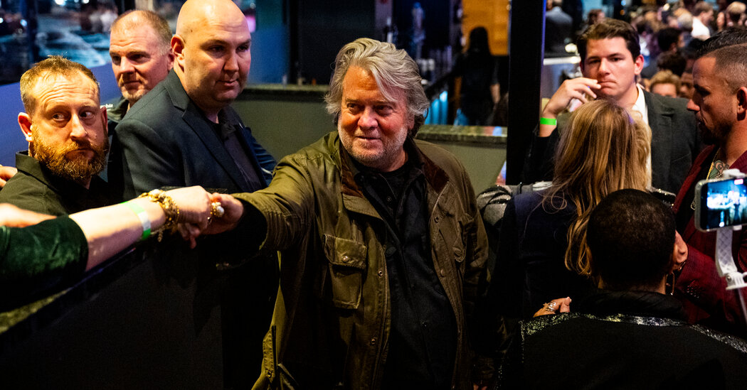 “The management is upset,” Mr. Bannon, the former Trump adviser turned podcaster, said to a crowd of a few hundred college Republicans, young political operatives and middle-aged MAGA-sphere celebrities. “You all aren’t drinking enough. I told them I was throwing a party, but you all are a bunch of pencil-necks. Are we drinking or not?”