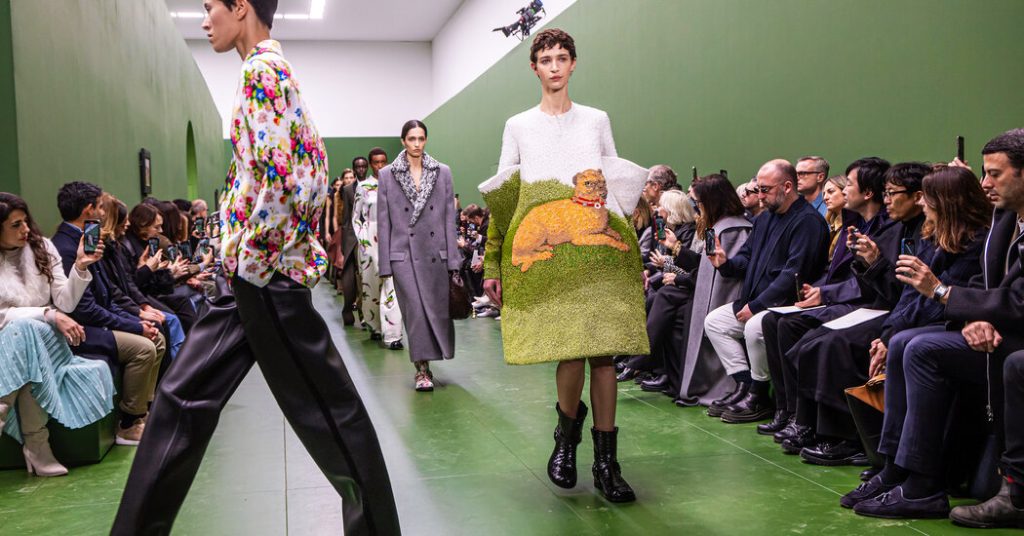 Such was the case anyway with Jonathan Anderson’s terrific Loewe collection, an exercise in free thinking framed like a gallery opening. Mr. Anderson had created a pop-up as a show venue, featuring 18 works by the 20th-century American painter Albert York, who specialized in small oil paintings of the natural world (landscapes, flowers, a cow or two). It was like a stream of consciousness in fashion form on class, heritage and modernity; the stuff we inherit, the identities we claim and what exactly “wealth” means.