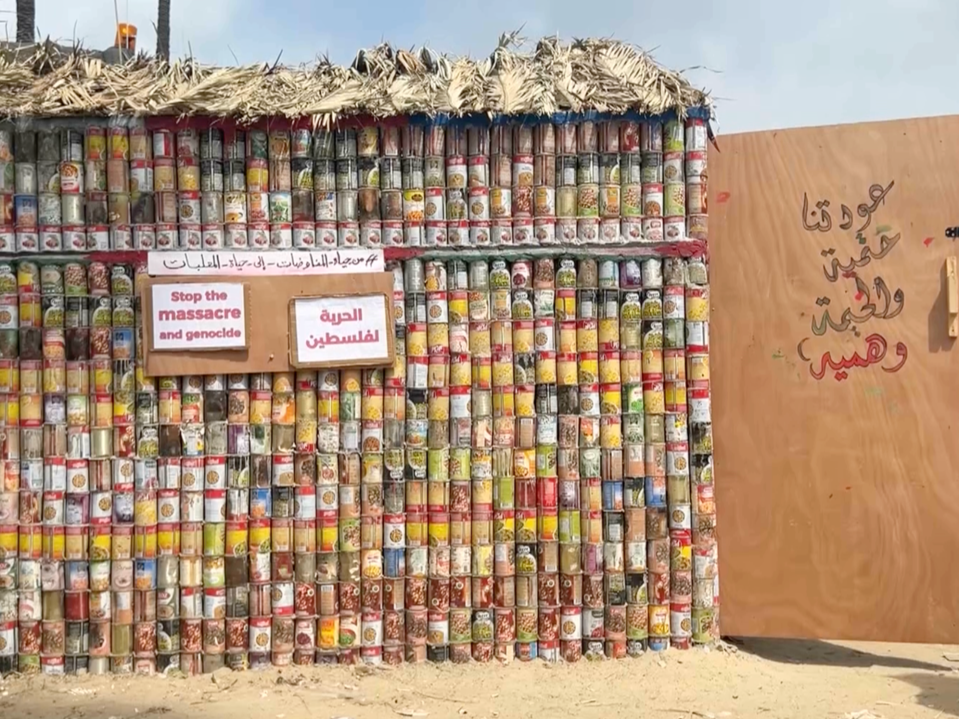 A building made of food aid cans stands out among the makeshift shelters at a refugee camp in northern Gaza. Built with the help of children in the camp, this structure aims to raise awareness about starvation across Gaza in order to encourage an international demand for a ceasefire with Israel.