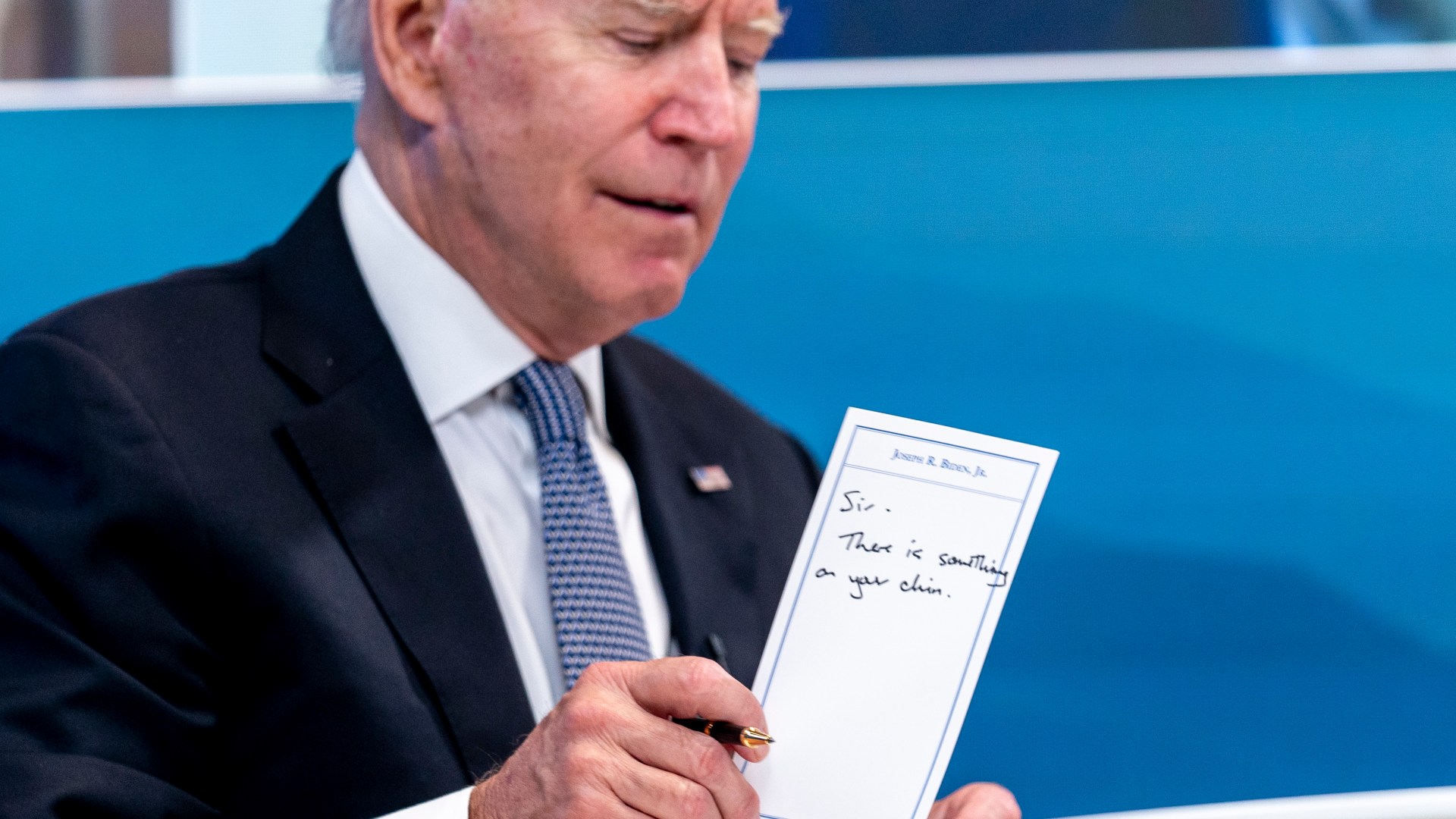 Others read “view from podium” and “view from audience” – suggesting how Biden is guided by his aides during his on-air appearances.