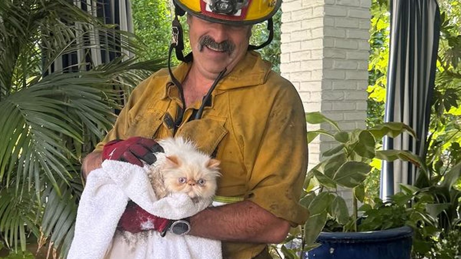Delevingne, 31, shared an image of one of the felines being carried by a firefighter, wrapped up safe in a blanket.