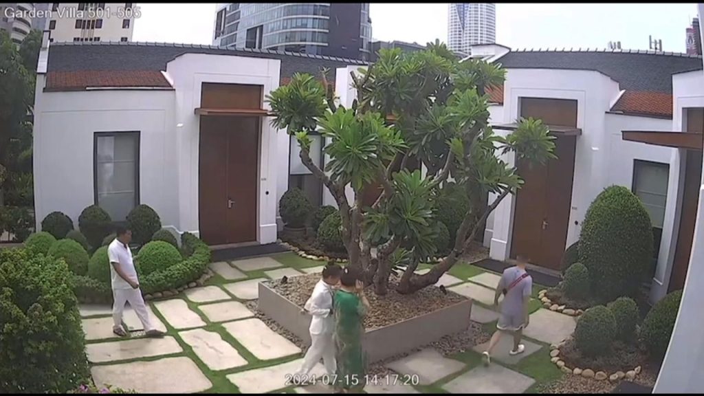 The CCTV video, focusing on an internal courtyard, captures five of the six victims at the luxury Grand Hyatt Erawan hotel in Thailand.
