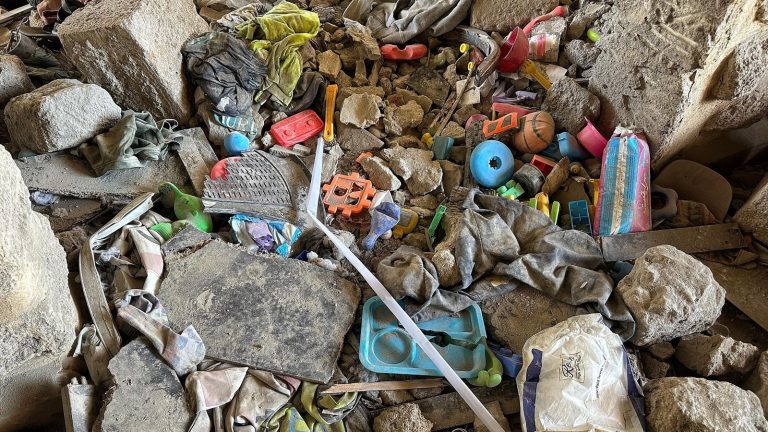 Children’s toys are still scattered around, half buried in the rubble. A wedding picture hanging on the wall shows a bride bending over backwards in her groom’s arms. Baby photographs still hang on the stone wall.