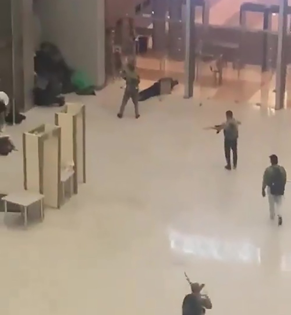 One showed two men with rifles moving through the mall.
