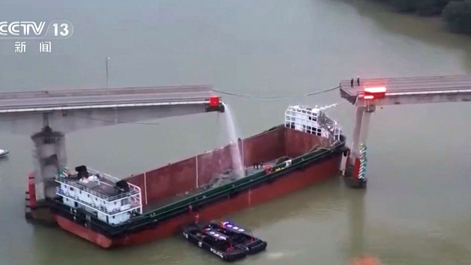 Pictures on CCTV showed an empty container barge trapped between two columns of the bridge over the Hongqili Waterway, with part of the bridge’s two-lane road deck missing.