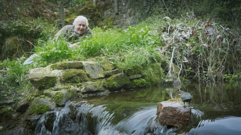 Joining the team for filming in the Wye Valley in Monmouth to capture the song of a wild dipper, Attenborough found himself lying on the damp ground hoping that the small bird would show up.