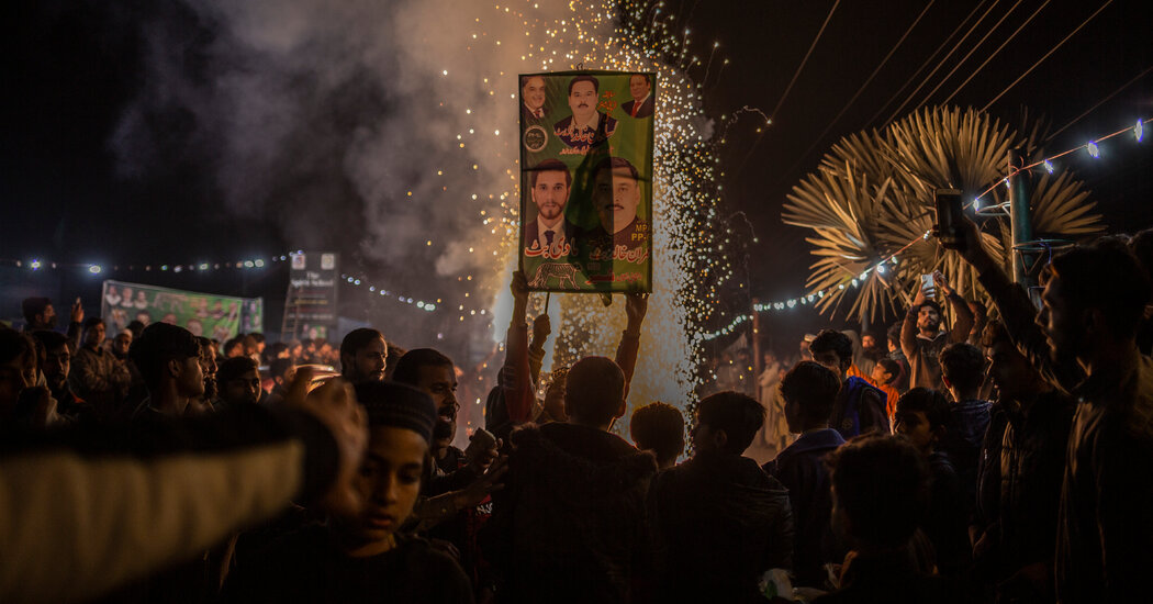 The young men sat on a dead patch of grass at the edge of a field in Wazirabad, half-watching a cricket match. Bored with the game, Umer Malik, 28, pulled out his phone and began scrolling through TikTok. Within a few seconds, there was a video showing a P.T.I. gathering with the words “Vote Only Khan,” another mocking the Pakistan Muslim League-Nawaz, or P.M.L.N., the party seen as favored by the military in this election, and one slow-motion shot of Mr. Khan walking through a crowd.