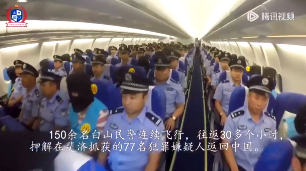 Footage shows how the Chinese police smashed down doors, hooded and handcuffed the alleged offenders, before herding them onto a private plane.