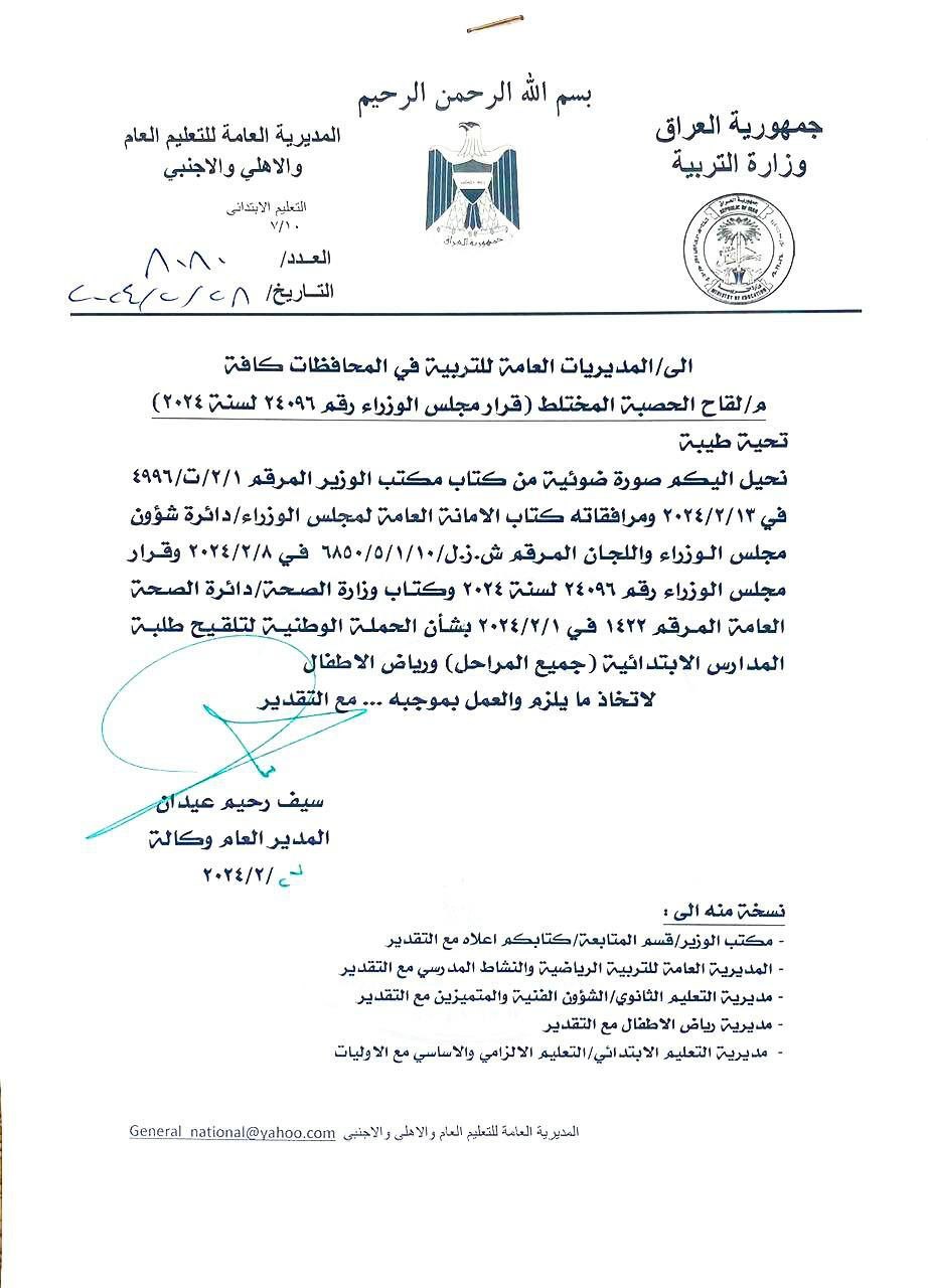 Share Facebook Twitter LinkedIn Pinterest Email Baghdad / NINA / The Ministry of Education announced the implementation of the national campaign to vaccinate primary school students against measles, in all governorates of Iraq./ End Source link