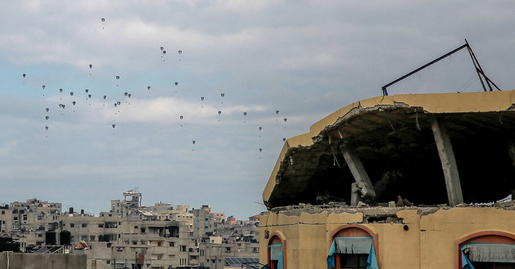 A video, circulating on social media and purporting to depict the incident, shows a plane releasing parachutes carrying aid packages over northern Gaza. In the clip, whose date and location were verified by The New York Times, it appears that one parachute failed to open, while multiple packages that were not attached to parachutes plummeted to the ground. In the clip, filmed near Al-Shati Camp, people can be seen running in different directions.