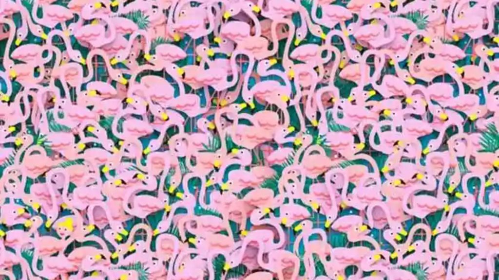 This twisted optical illusion shows a large group of flamingos standing inside a lake with their necks craning in different directions.