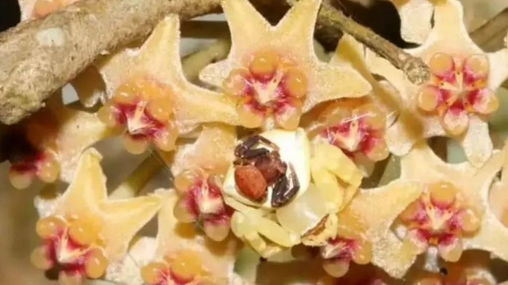 In the image, we can see a small brown coloured spider sitting on top of a flower, known as a Hoya pandurata.