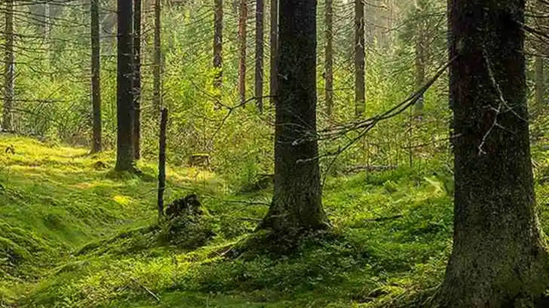 The picture shows an enchanting forest with green moss covering the floor and tall trees towering above.