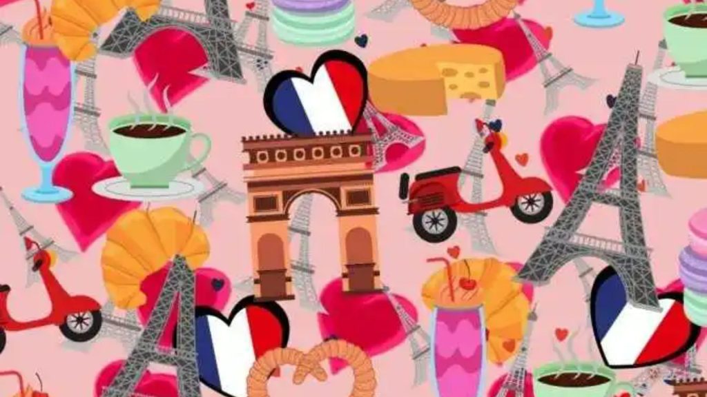 The image shows lots of French items like the Eiffel tower, macaroons and croissants.