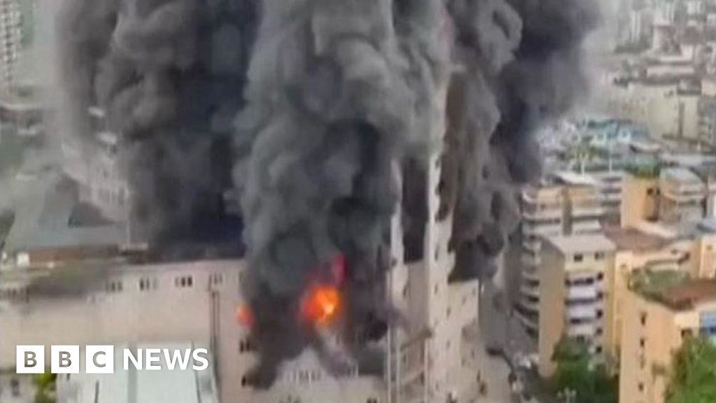 Footage broadcast by China’s state media and on social media showed thick black smoke towering above the building.