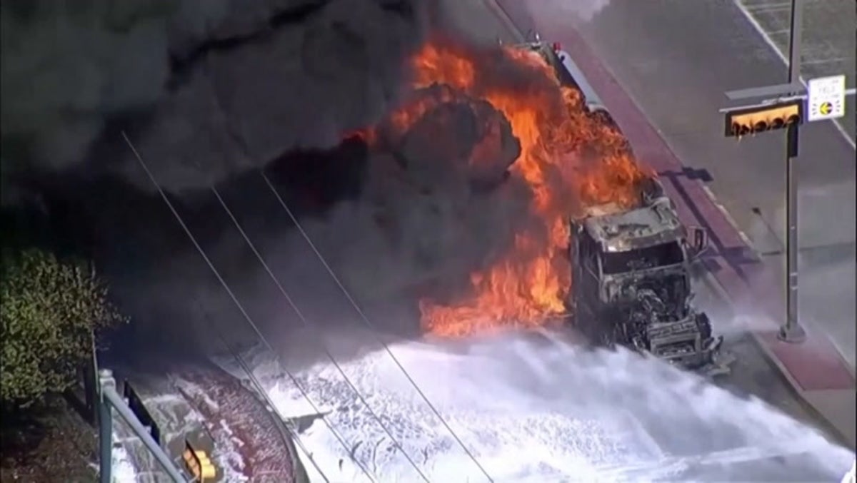 Footage shows the tanker engulfed in flames in the middle of the road.