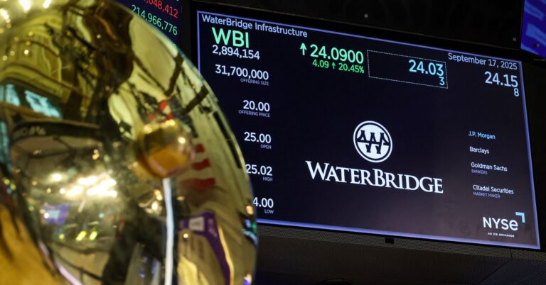 Share Facebook Twitter LinkedIn Pinterest Email WaterBridge Infrastructure’s shares jumped 14.2% in their debut on the New York Stock Exchange on Wednesday, giving the midstream water management firm a market valuation of around $2.6 billion.