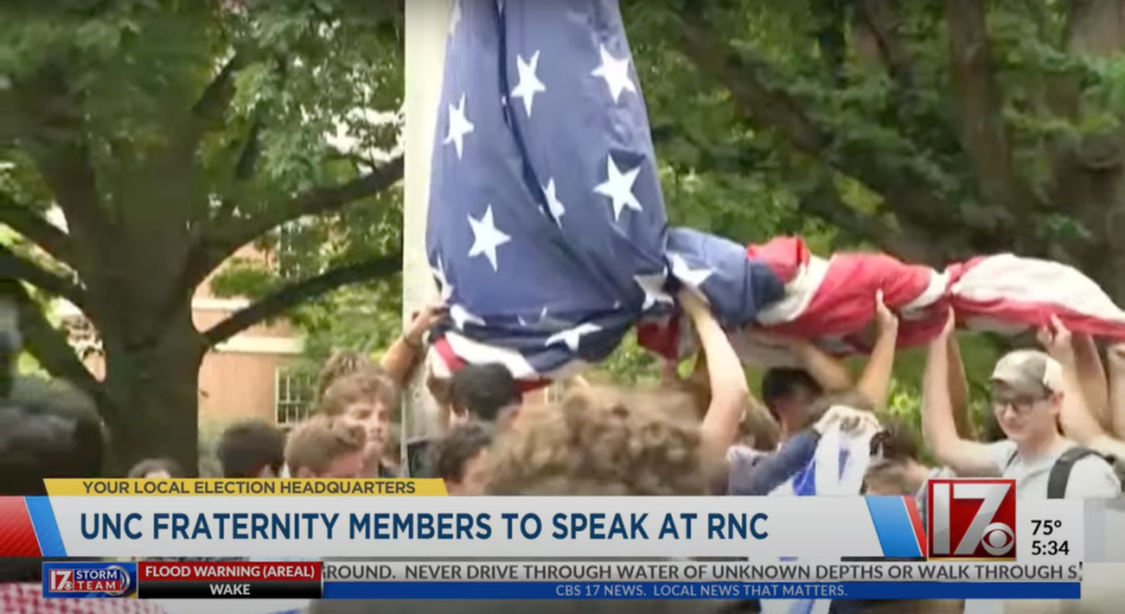 “A group of students and fraternity brothers at the University of North Carolina at Chapel Hill patriotically protected an American flag that had been disturbed by demonstrators during an anti-Israel protest on their campus,” the Trump campaign said on July 12.