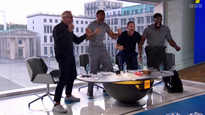 The BBC Match of the Day host was celebrating England’s penalty win with fellow pundits Frank Lampard, Rio Ferdinand and Micah Richards, when he made an unfortunate slip up.