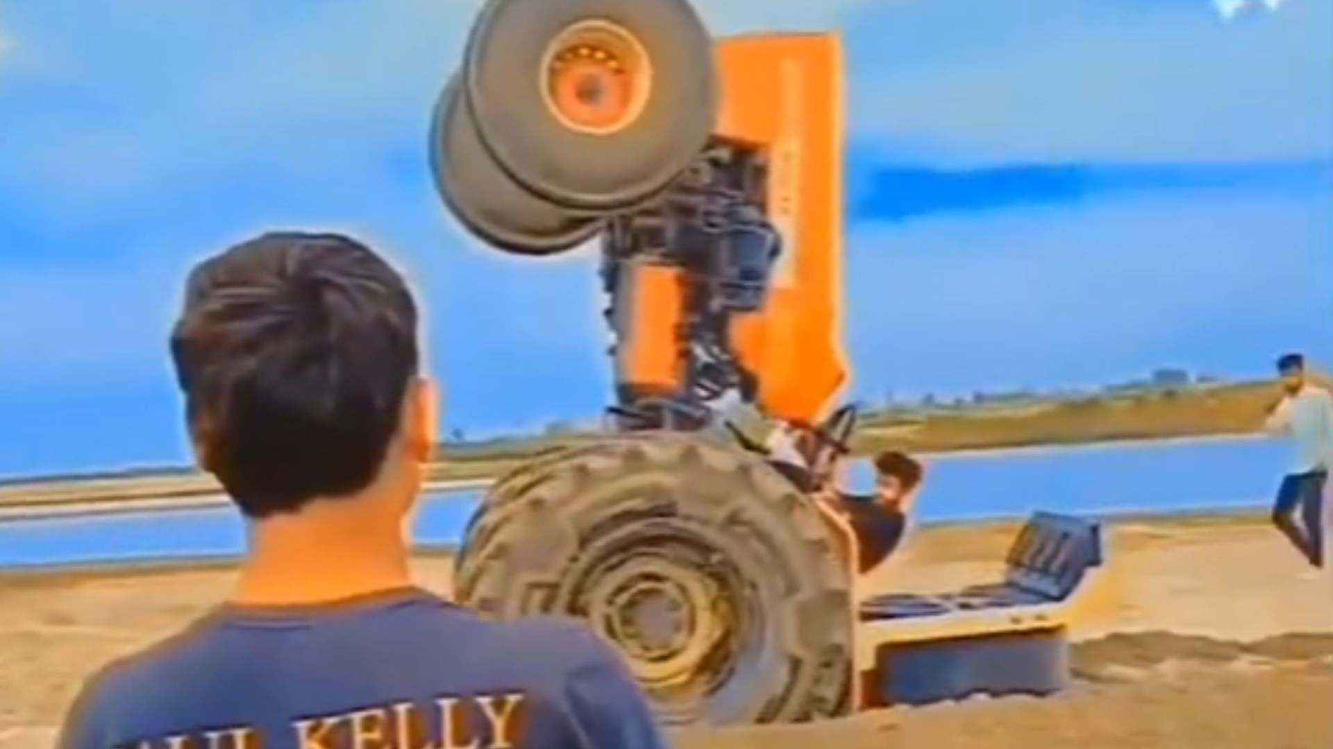 Slowly the heavy motor starts to tip back as the massive wheels spin in the soft, sandy ground start to lose traction.