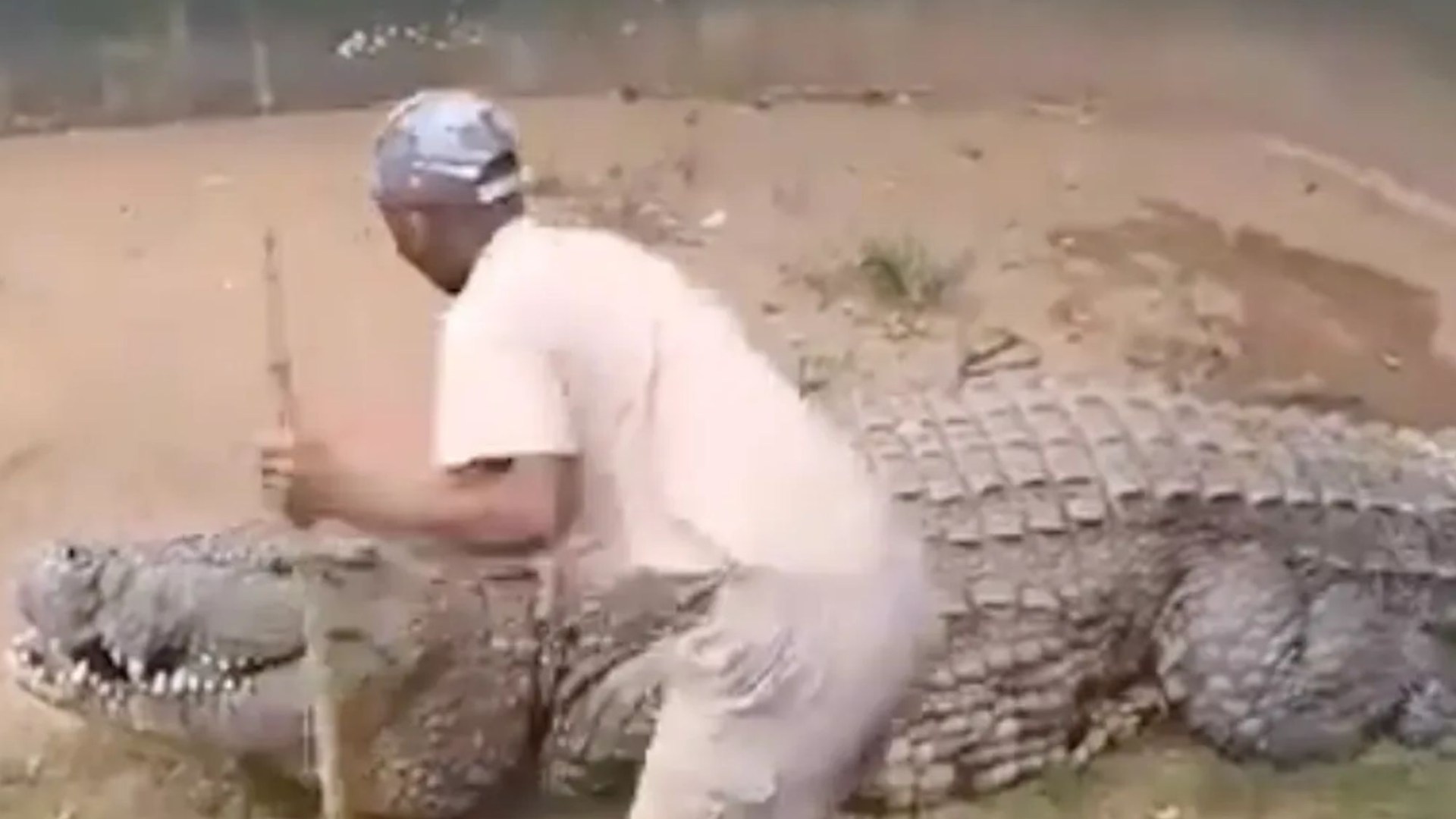 The shocked crocodile handler had been poking the beast with a stick whilst inside its closure, however, provoking it to whip its head round and take a bite.