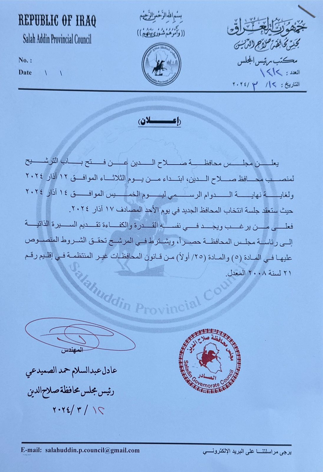 Share Facebook Twitter LinkedIn Pinterest Email Baghdad / NINA / The Saladin Governorate Council announced, today, Tuesday, the opening of nominations for the position of head of the local government in the governorate./End 3 Source link