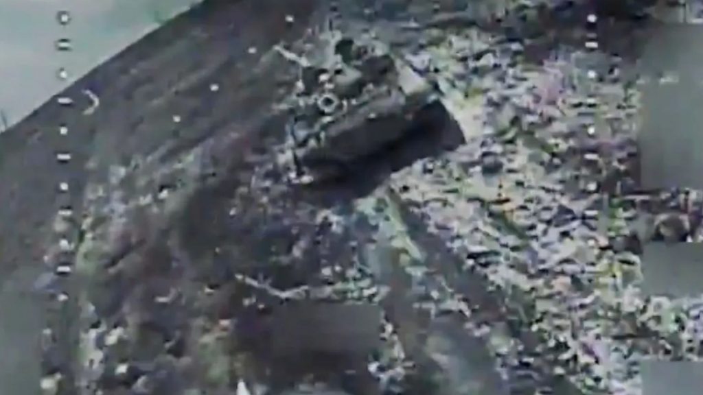 Moments later the drone smashes into the tank and a huge spark is seen upon the heavy impact.
