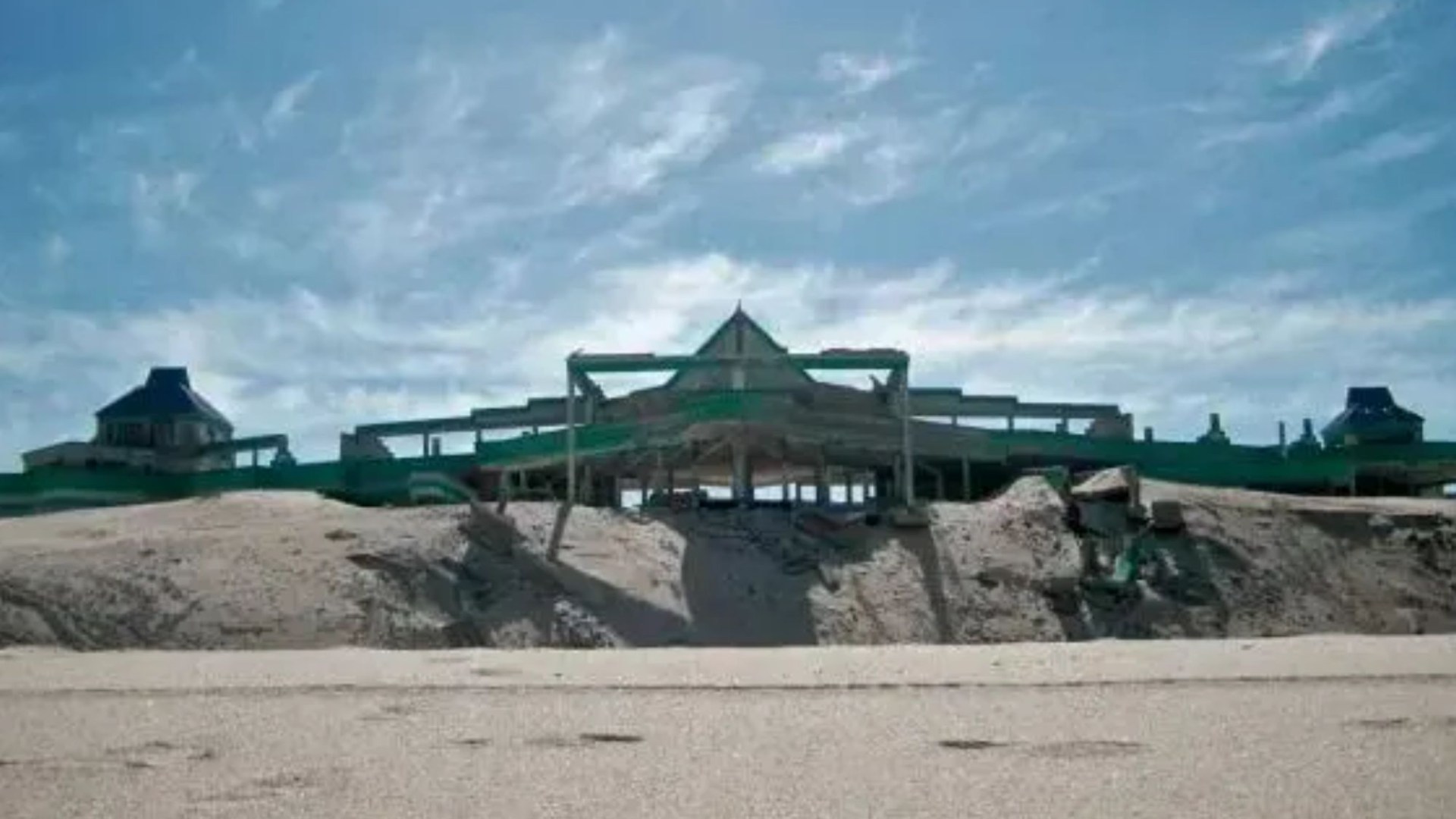 Brightly-painted ruins now create an eerie setting along the golden beach, where derelict buildings and damaged water slides are all that’s left of the former site.