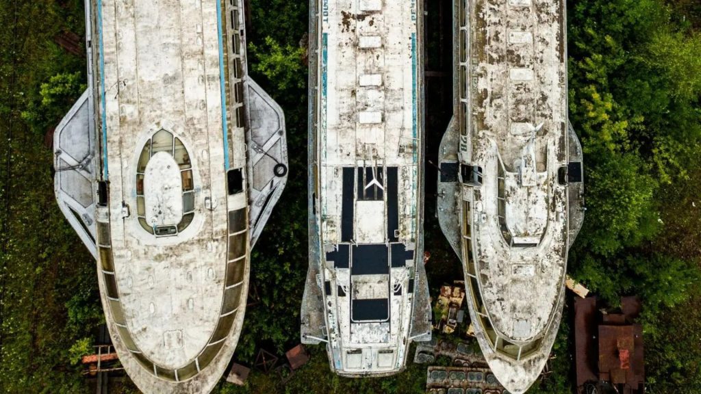 Rows upon rows of the enormous passenger boats are lined up in the eerie collection – a reminder of the once ‘golden’ Soviet era.