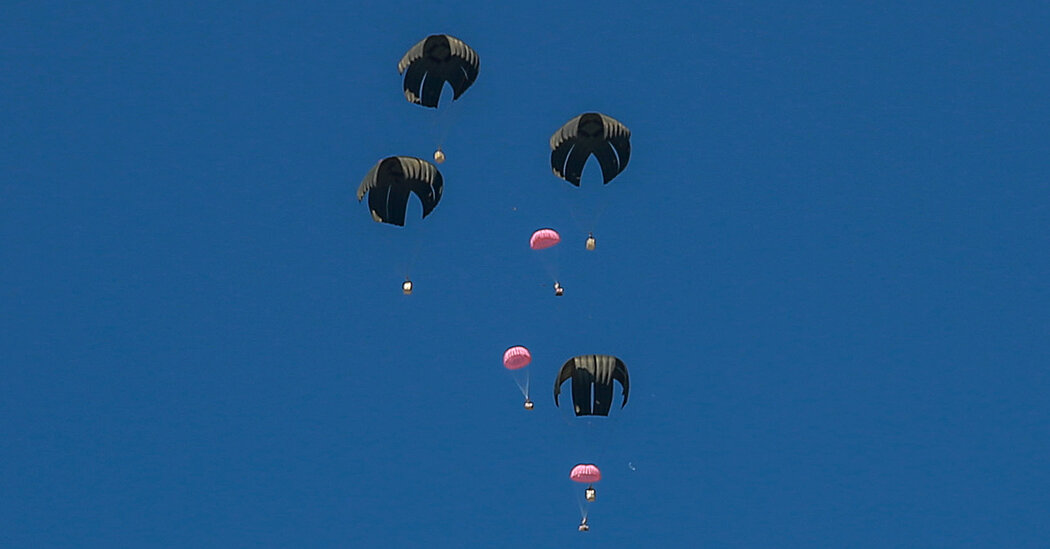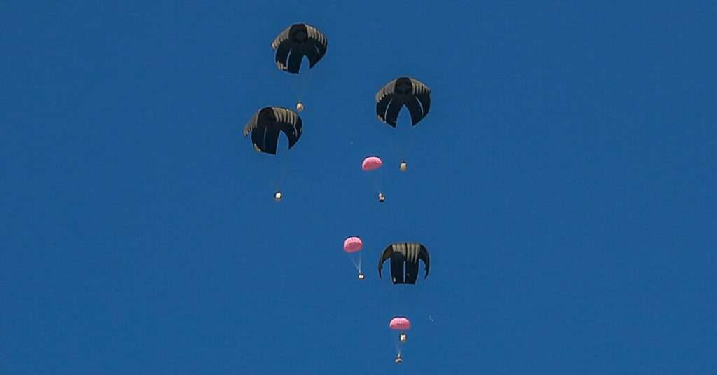 A video, circulating on social media and purporting to depict the incident, shows a plane releasing parachutes carrying aid packages over northern Gaza. In the clip, whose date and location were verified by The New York Times, it appears that one parachute failed to open, while multiple packages that were not attached to parachutes plummeted to the ground. In the clip, filmed near Al-Shati Camp, people can be seen running in different directions.