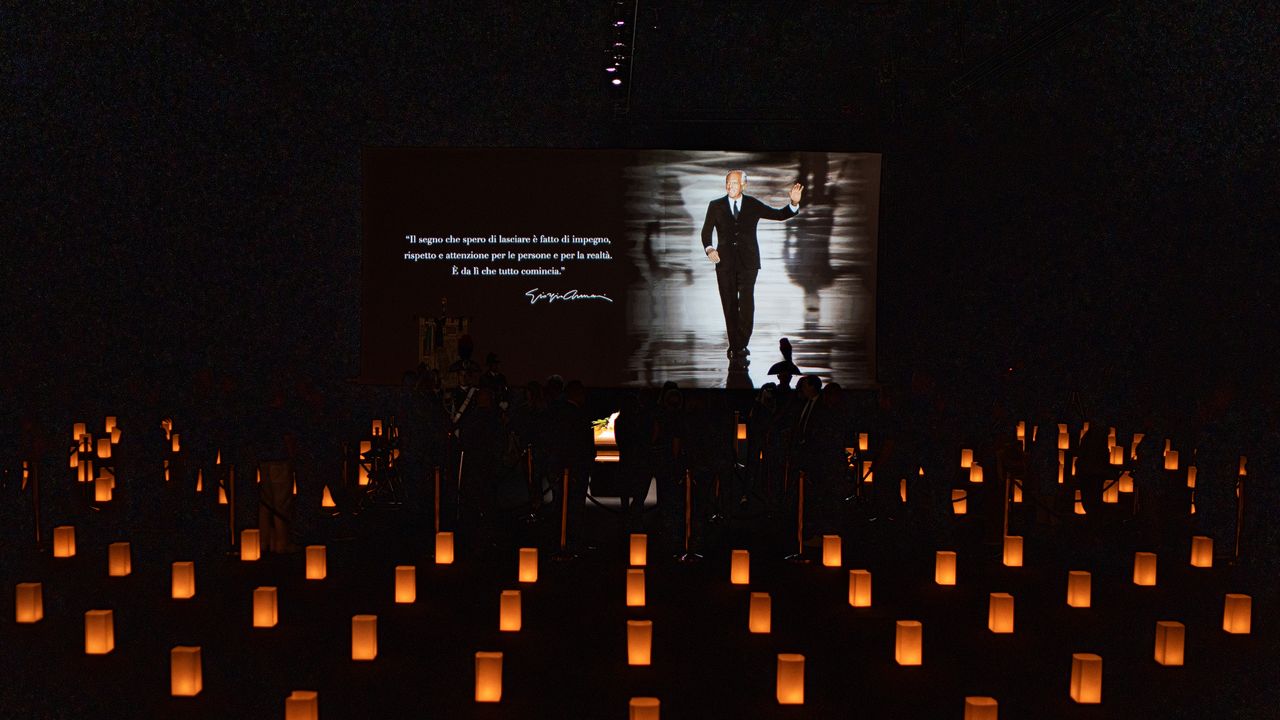 It was undeniably strange, poignant, and powerful to be briefly in the presence of Mr. Armani—in the same space where we saw him show so many collections, take so many bows, and share so many opinions—for this very last time. The room was dotted with the evocative flickering lanterns that were his favorite evening decoration. The moving piano piece Nuvole Bianche by Ludovico Einaudi (Mr. Armani’s own choice, of course) played through the gloom.