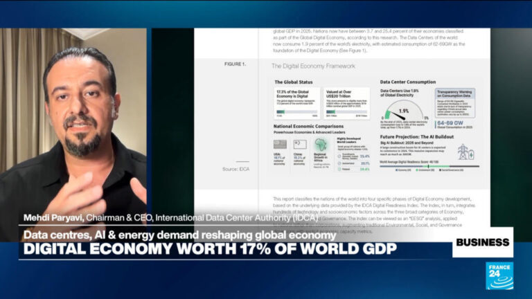 The digital economy now accounts for 17% of global GDP, worth over 20 trillion dollars according to a new report by the International Data Centre Authority. But growth has been uneven across the world with more than one billion people having poor access to electricity. IDCA’s CEO Mehdi Paryavi tells France 24 that poorer nations can develop digital economies that can empower the nation and improve energy access and education.