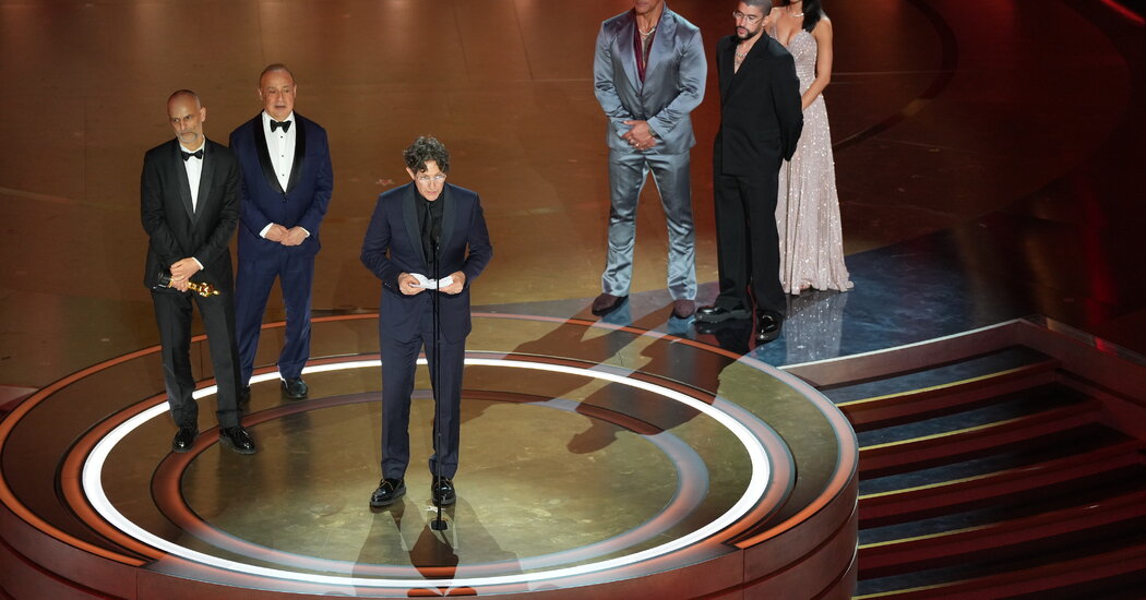 The director Jonathan Glazer read from prepared remarks after the film won for best international feature, offering thanks to collaborators before turning to the conflict.